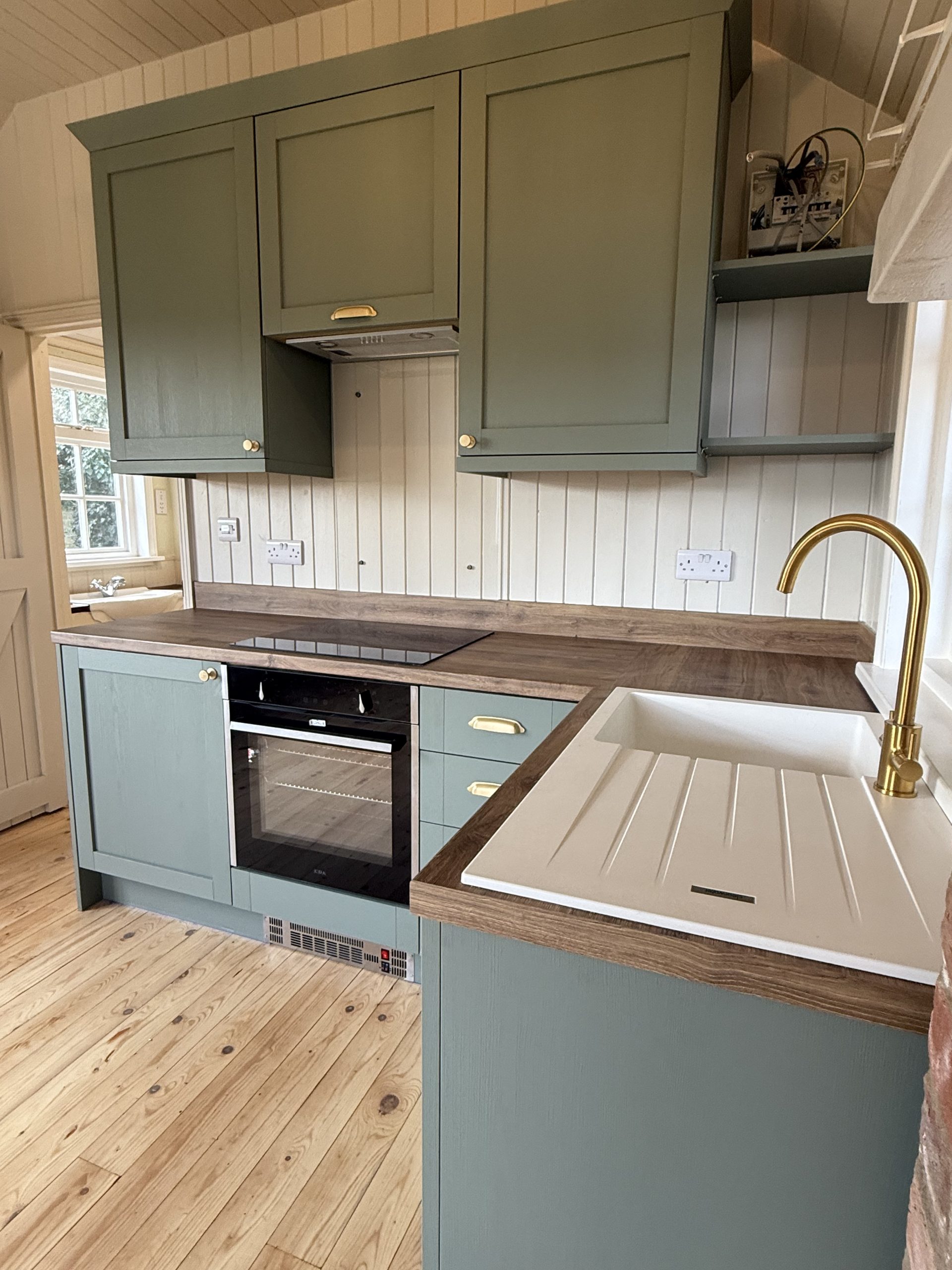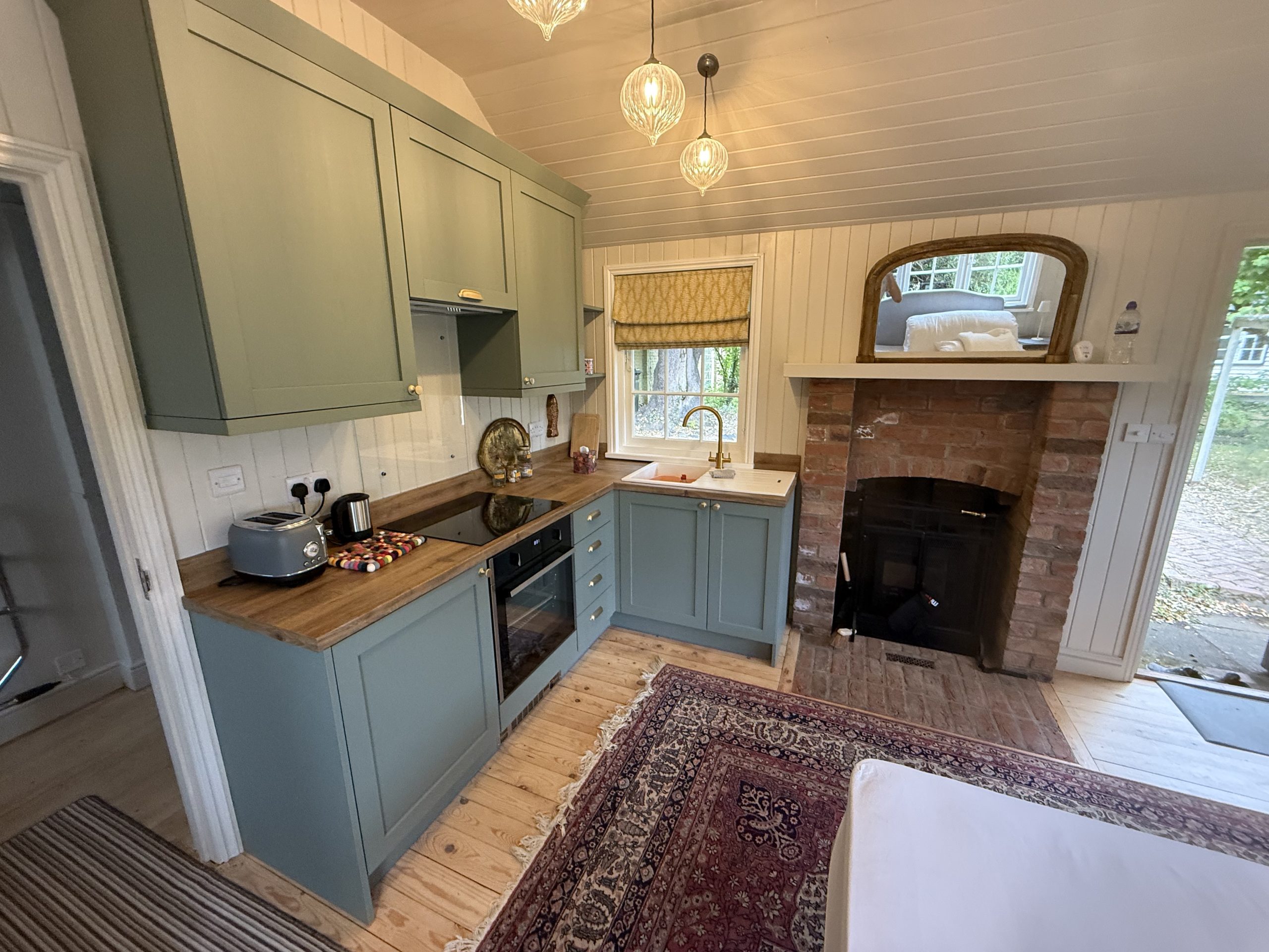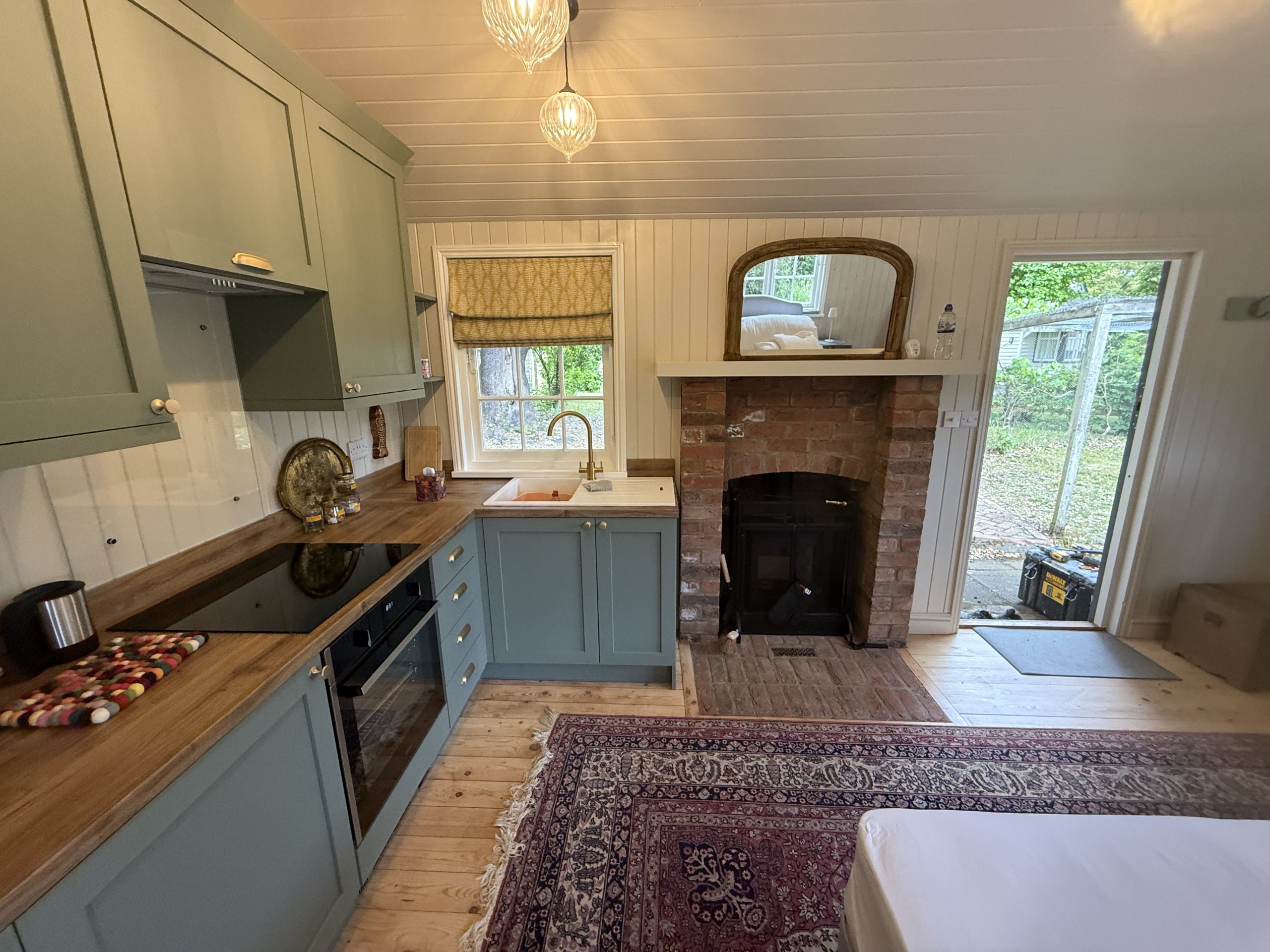 We reimagined the compact kitchen with custom cabinetry, soft-close drawers, and space-saving solutions. A new oak worktop and matte black fixtures added a modern edge while preserving the natural aesthetic.