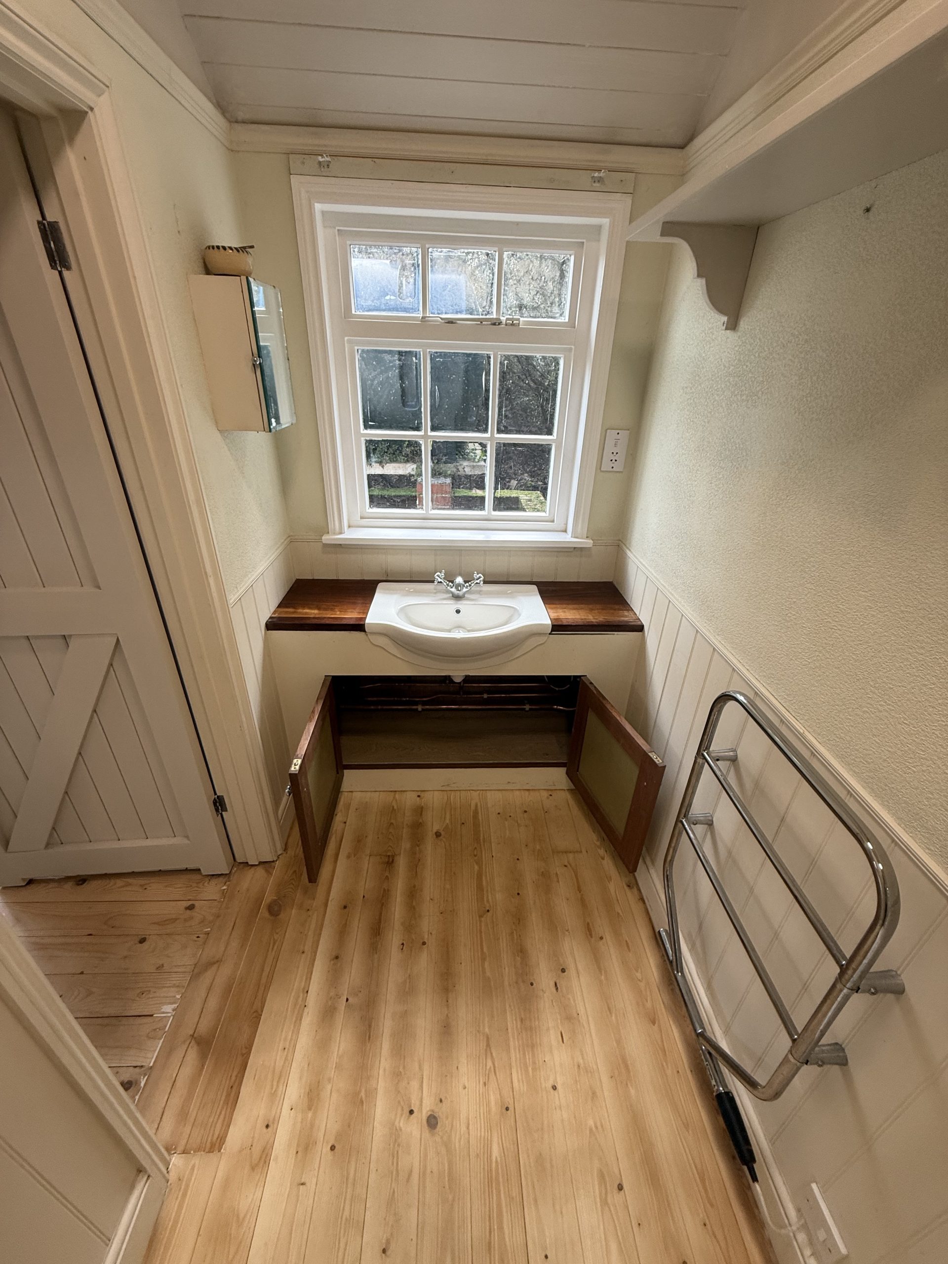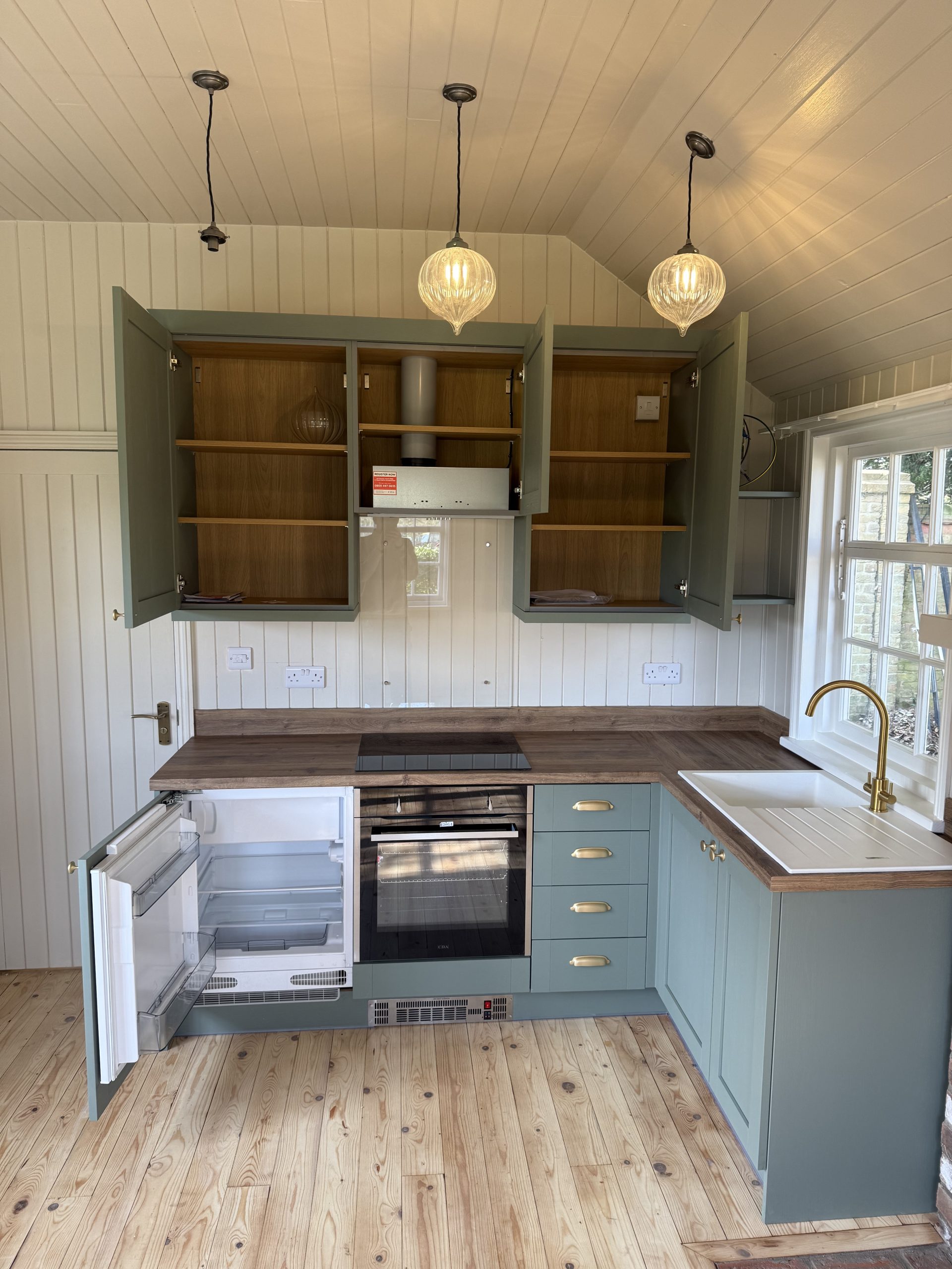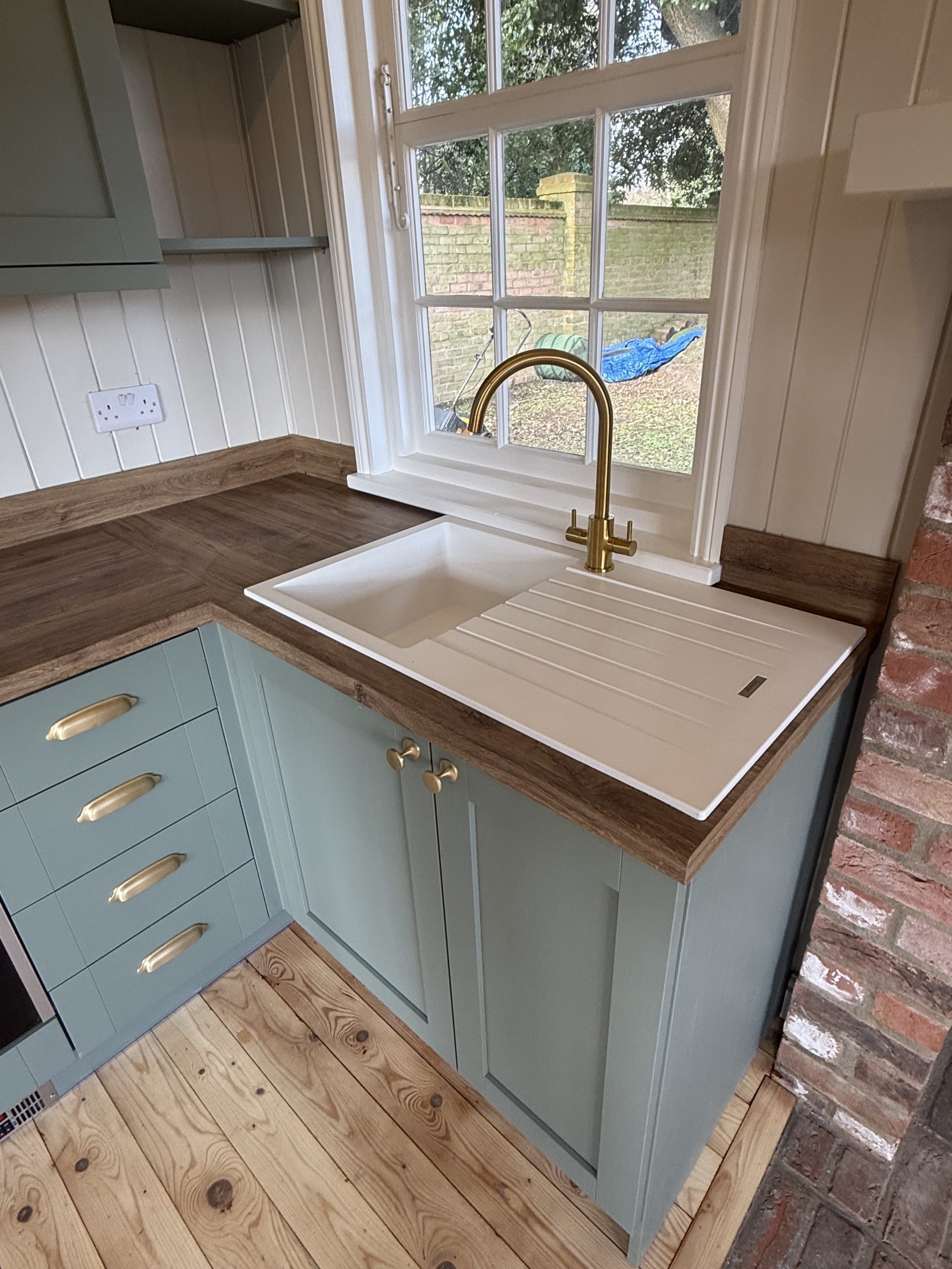 We reimagined the compact kitchen with custom cabinetry, soft-close drawers, and space-saving solutions. A new oak worktop and matte black fixtures added a modern edge while preserving the natural aesthetic.