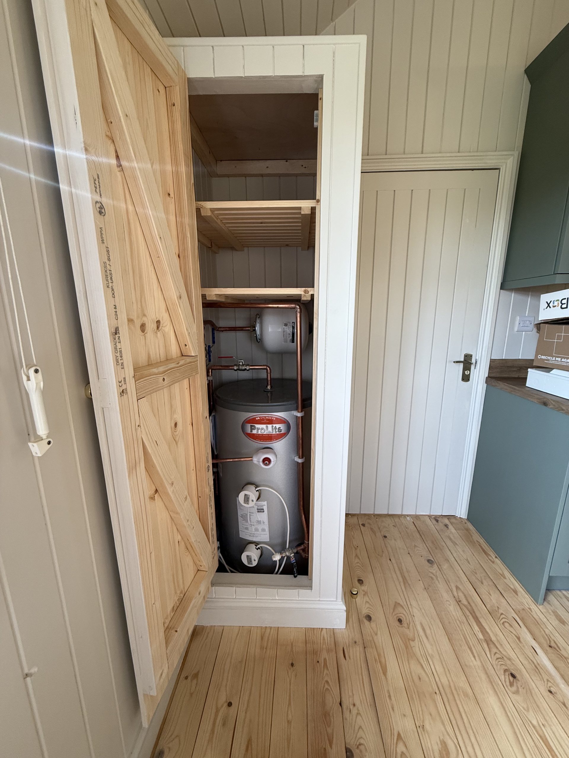 Tucked into an alcove, we crafted a made-to-measure oak cupboard for coats, boots, and outdoor gear. It’s practical, beautiful, and blends seamlessly with the cabin’s timber interior.