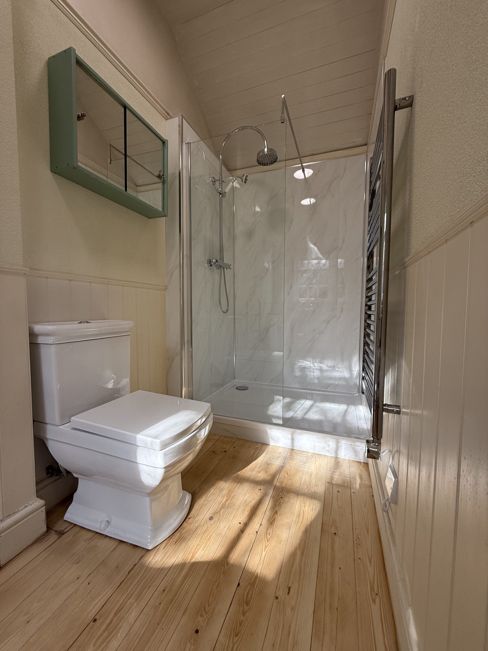 The bathroom now features a walk-in shower with slate-effect tiles, a floating vanity unit, and ambient lighting for a spa-like feel. It’s a small space with a significant impact.